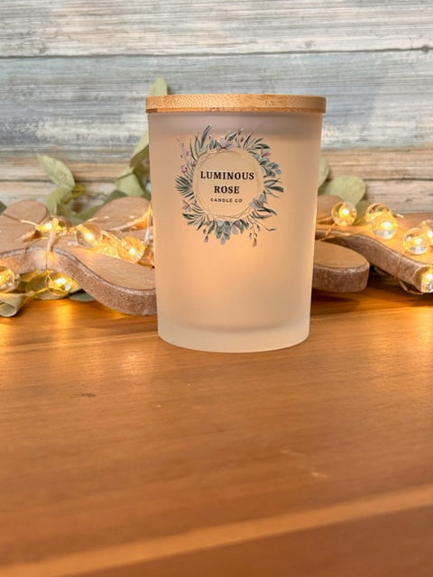 The 9 oz aura is a classic glass vessel that is frosted and includes a wood lid.